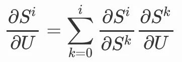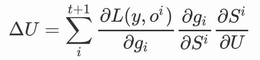 我们会发现,当前时间步的变量St会包含前一步的变量St-1,此时我们选择对U或者W求梯度,就不能忽略掉前一步的变量,因为前一步的变量中也包含了参数U和W,那么我们在对U进行更新时,就需要将前面的时间步递归展开:
