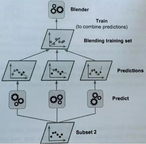 此外,你可以用这种方法训练好几个元学习者(例如,一个使用线性回归,另一个使用随机森林回归,等等)。要使用多个元学习者,必须将训练集分为三个或以上的子集:第一个子集用于训练第一层预测器,第二个用于对未知数据进行预测并创建新的数据集,第三个用于训练元学习者并对目标值进行预测。