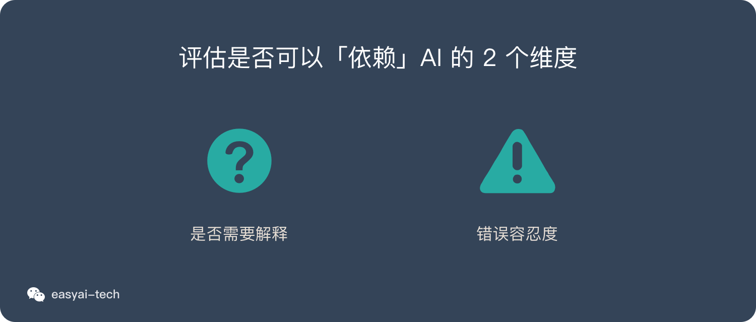 所以从「可解释性」和「错误容忍度」上可以评估出来哪些问题不适合「完全依赖人工智能」。