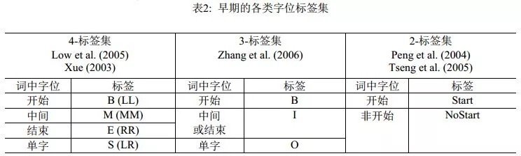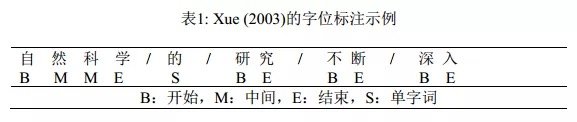 基于字标注学习的方法始于Xue (2003)。该工作使用一个字在词中的四种相对位置标签(tag),即B、M、 E和S等字位(如表1所示),来表达该字所携带的切分标注信息,从而首次将分词任务形式化为字位的串标注学习任务。串标注学习是自然语言处理中最基础的结构化学习任务,在串标注的概率图模型中, 两个串的各个节点单元需要严格一一对应, 非常方便于使用各种成熟的机器学习工具来建模和实现。Xue (2003)的首次实现其实尚未充分使用串标注结构学习,而是直接应用了字位分类模型。 Ng & Low(2004)和Low et al. (2005)才是第一次将严格的串标注学习应用于分词, 用的是最大熵(Maximum Entropy,ME) Markov模型。而Peng et al. (2004)和Tseng et al. (2005)则自然地将标准的串标注学习工具条件随机场引入分词学习。随后, CRF多个变种构成了深度学习时代之前的标准分词模型。