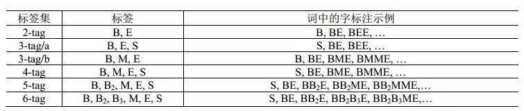 由于分词是自然语言处理的一个起始任务,因此串标注学习下的可选特征类型相当有限。实际上,能选用的只是滑动窗口下的n-gram特征, n-gram单元为字或者词。理论上,以单个n-gram特征为单位进行任意的特征模板选择,在工程计算量上是可行的。实际的系统中,对于字特征多采取5字的滑动窗口,而Zhao et al. (2006a)及其后续工作则仅用3字窗口;对于词,则多采取3词的滑动窗口。然而,字位标注并非直接的切分点学习,从后者(切分点)到前者(字位标注系统)有着多种方案,而一旦字位标注发生改变,相应的优化n-gram特征集显然会发生改变。这一现象的发现及其完整的经验研究,发表在Zhaoet al. (2006b)和Zhao et al. (2010a)中。表2和表3分别列出了之前的标注集和Zhao et al. (2010a)考察过的完整标注集序列, 后者证明在6-tag标注集配合使用3字窗口的6个n-gram特征(分别是C-1, C0, C1, C-1C0, C0C1,C-1C1,其中C0代表当前字),即可获得字位标注学习的最佳性能(默认使用CRF模型)。
