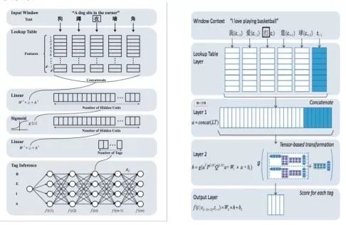2014年,Pei et al. (2014)对Zheng et al. (2013)的模型做了重要改进,引入了标签向量来更精细地刻画标签之间的转移关系, 其改进程度类似于Low et al. (2005)首次引入Markov特征到Ng & Low (2004)的最大熵模型之中。Pei et al.提出了一种新型神经网络即最大间隔张量神经网络(Max-Margin Tensor NeuralNetwork, MMTNN)并将其用于分词任务(见图1右),使用标签向量和张量变化来捕捉标签与标签之间、标签与上下文之间的关系。另外,为了降低计算复杂度和防止过拟合(所有神经网络模型的通病),该文还专门提出了一种新型张量分解方式。