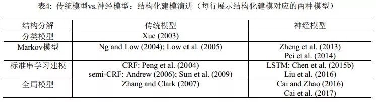 同年, Chen et al. (2015b)针对滑动窗口的局部性,提出用长短期记忆神经网络(Long Short-TermMemory Neural Networks, LSTM)来捕捉长距离依赖, 部分克服了过往的序列标注方法只能从固定大小的滑动窗口抽取特征的不足。 Xu & Sun(2016)将GRNN和LSTM联合起来使用。 该工作可以看作是结合了Chen et al. (2015a)和Chen et al. (2015b)两者的模型。该模型中,先用双向LSTM提取上下文敏感的局部信息,然后在滑动窗口内将这些局部信息用带门结构的递归神经网络融合起来,最后用作标签分类的依据。 LSTM是神经网络模型家族中和线性链CRF同等角色的结构化建模工具,随着它被引入分词学习,神经网络模型在分词性能上开始可以和传统机器学习模型相抗衡。我们将结构化建模的传统-神经模型的对照情况列在表4中。