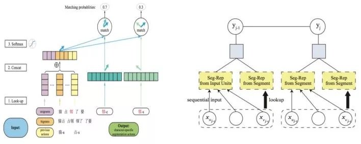 与传统方法中基于字的序列标注方案几乎一统江湖的局面不同,神经网络有相对更灵活的结构化建模能力,因而有别于序列标注的其他方法也相继涌现出来。 Ma & Hinrichs (2015)提出了一种基于字的切分动作匹配算法,该算法在保持相当程度的分词性能的同时,有着不亚于传统方法的速度优势。具体来说,该文提出了一种新型的向量匹配算法,可以视为传统序列标注方法的一种扩展,在训练和测试阶段都只有线性的时间复杂度(见图2左)。该工作有两个亮点值得注意:一,首次严肃考虑了神经模型分词的计算效率问题;二,遵循了严格的SIGHAN Bakeoff封闭测试的要求,只使用了简单的特征集合,而完全不依赖训练集之外的语言资源。