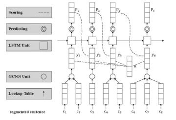Cai & Zhao(2016) 彻底放弃滑动窗口,提出对分词句子直接建模的方法,以捕捉分词的全部历史信息, 提出了一个类似于Zhang & Clark (2007)的神经分词模型, 同时充分吸收了前面一些工作的有益经验,如门网络结构等(图3)。由于覆盖了前所未有的特征范围,该模型在封闭测试意义上取得了和传统模型接近的分词性能。 概括来说,该方法使用了一个带自适应门结构的组合神经网络,词向量表示通过其字向量生成,并用LSTM网络的打分模型对词向量序列打分。这种方法直接对分词结构进行了建模,能利用字、词、句三个层次的信息,是首个能完整捕捉切分和输入历史的方法。与之前的无论传统和还是深度学习的方法相比,该模型将分词动作依赖的特征窗口扩张到最大程度(见表5)。该文所提的分词系统框架可以分为三个组件:一个依据字序列的词向量生成网络组合门网络 (gated combination neuralnetwork, GCNN,见图4左);一个能对不同切分从最终结果(也就是词序列)上进行打分的估值网络;和一种寻找拥有最大分数的切分的搜索算法。第一个模块近似于模拟中文造词法过程,这对于未登陆词识别有着重要意义;第二个模块从全句的角度对分词的结果从流畅度和合理性上进行打分,能最大限度地利用分词上下文;第三个模块则使在指数级的切分空间中寻找最可能的切分最优解。