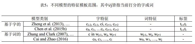 Zhang et al. (2016)提出了一种基于转移的模型用于分词,并将传统的特征模版和神经网络自动提取的特征结合起来, 在神经网络自动提取的特征和传统的离散特征的融合方法做了尝试。结果表明,通过组合这两种特征,分词精度可以得到进一步提升。