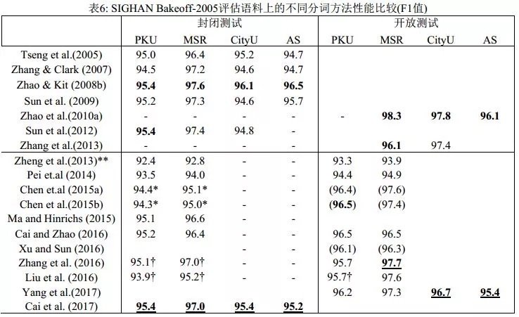 说明:表格上部展示的是传统方法,下部是深度学习方法。标有双星号(**)的是来自Pei et al. (2014)的再运行结果;标有星号(*)的是来自Cai & Zhao (2016)的再运行结果;带有† 是指使用了或者可能使用了预训练的字向量;带有‡ 侧是依赖传统模型(在大规模未标注语料上使用传统切分的结果进行预训练);而括号(…)里的结果使用了成语表。