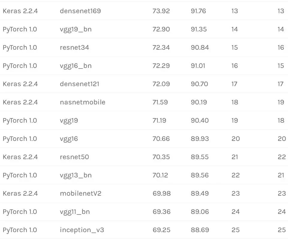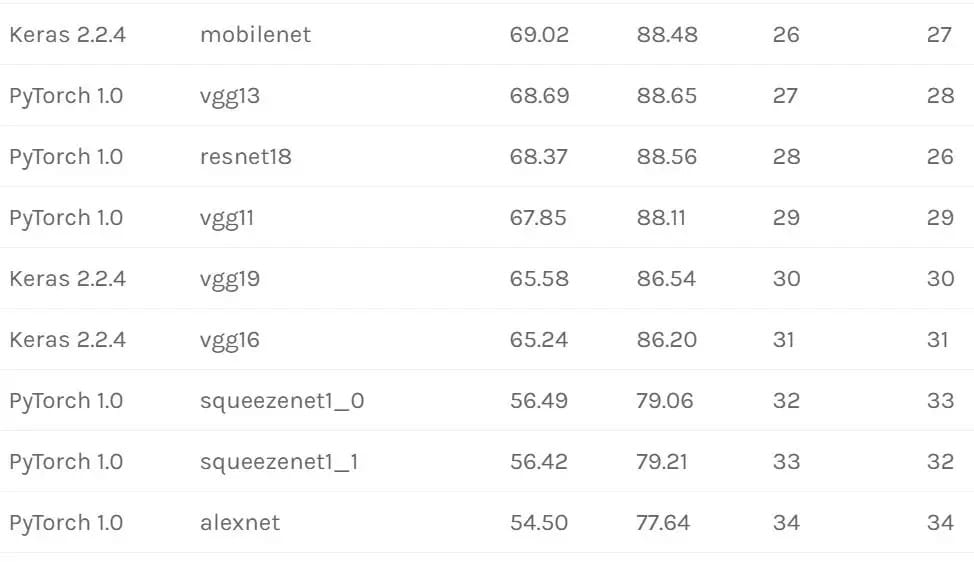在 Keras 和 PyTorch 基准项目中,MIT 在读博士 Curtis G. Northcutt 复现了 34 个预训练模型。该基准结合了 Keras 和 PyTorch,并将它们统一到一个框架内,这样我们就能知道这两个框架的对比结果,知道不同模型用什么框架好。例如,项目作者表示 ResNet 架构的模型使用 PyTorch 要比 Keras 效果好,Inception 架构的模型使用 Keras 又要比 PyTorch 好。