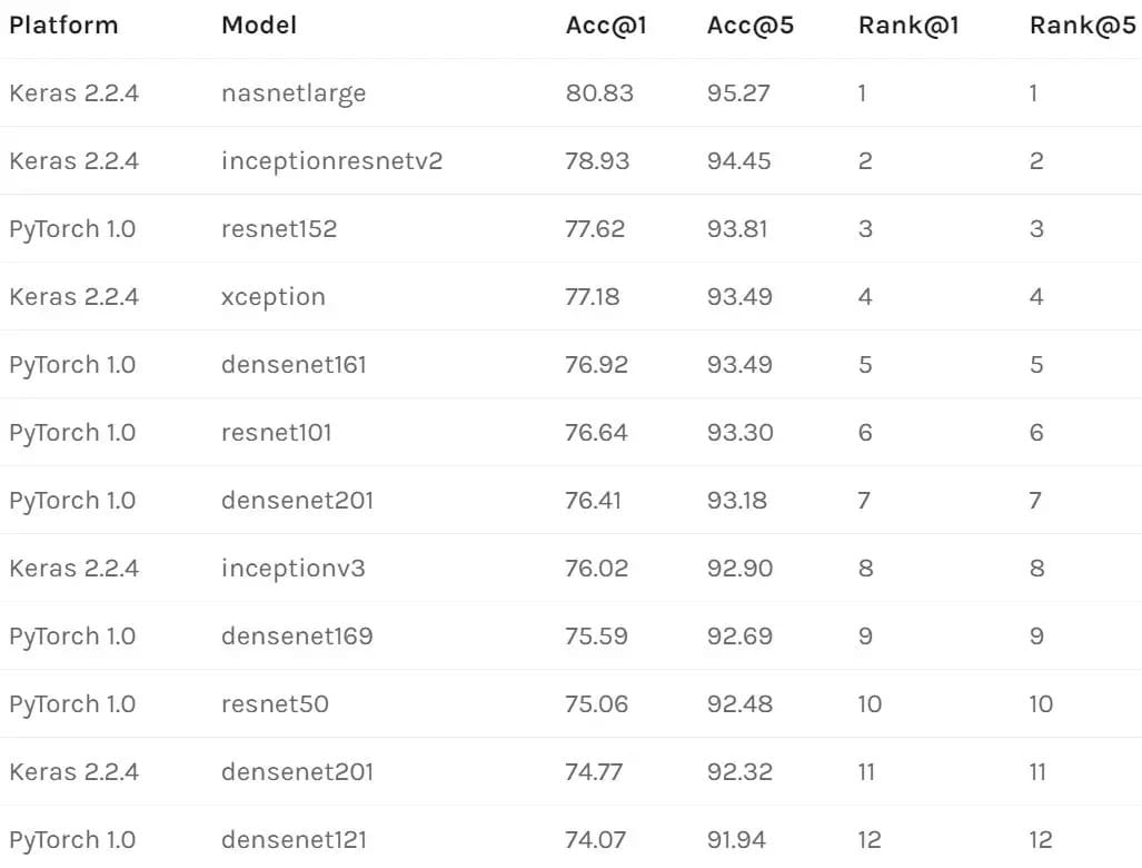 Section titled “Keras 和 PyTorch Benchmark”现在如果我们从预训练模型的角度看,那么相同的模型在不同的框架上,验证集准确度又是什么样的?在这个项目中,作者用两个框架一共复现了 34 个预训练模型,并给出了所有预训练模型的验证准确率。所以该项目不仅能作为对比依据,同时还能作为学习资源,又有什么比直接学习经典模型代码更好的方法呢?