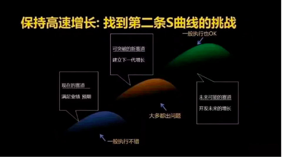 Section titled “成长企业的第二条发展S曲线”第一个,必须要判断方向,我的第二条S曲线是朝哪个方向走。判断方向的核心,是要对市场的未来做判断,对技术的未来做判断,对产品的未来做判断。