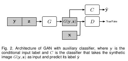 为了提供更多的辅助信息并允许半监督学习,可以向判别器添加额外的辅助分类器,以便在原始任务以及附加任务上优化模型。这种方法的体系结构如下图所示,其中 C 是辅助分类器。