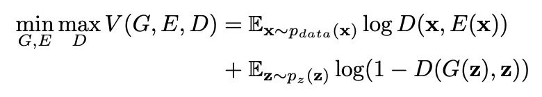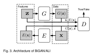 为了允许这样的映射,两个并发的工作 BiGAN [8] 和 ALI [9] 在原始 GAN 中添加编码器 E,如下图所示。