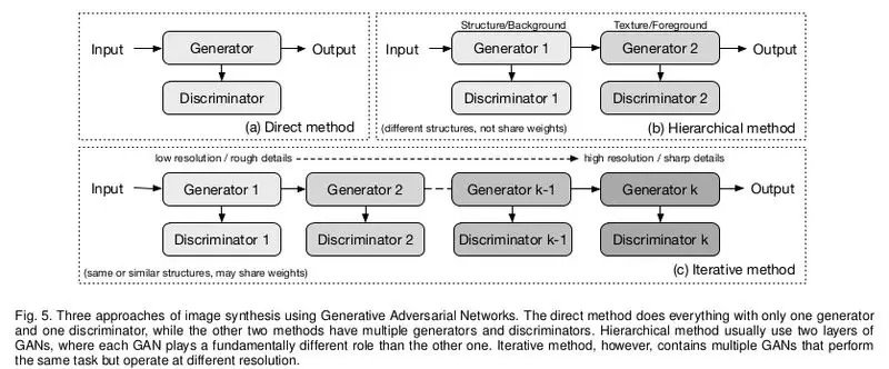 Section titled “GAN在图像生成方法”GAN 在图像生成中的主要方法为直接方法,迭代方法和分层方法,这三种方法可由下图展示: