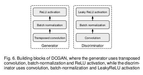 其中,DCGAN 是最经典的之一,其结构被许多后来的模型使用,DCGAN 中使用的一般构建块如下图所示,其中生成器使用反卷积,批量归一化和 ReLU 激活,而判别器使用卷积,batchnormalization 和 LeakyReLU 激活,这也是现在很多 GAN 模型网络设计所借鉴的。