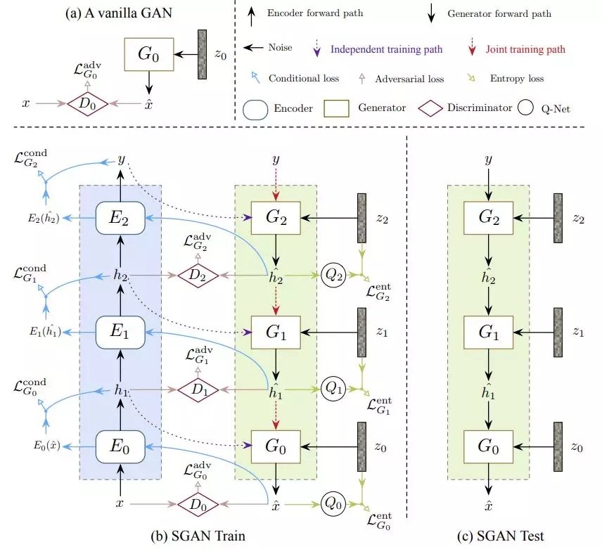 对不同级别的特征使用单独的生成器的必要性是 SGAN 关联编码器,判别器和 Q 网络(用于预测 P(zi|hi) 的后验概率以进行熵最大化,其中 hi 每个生成器的第 i 层的输出特征),以约束和改善这些特征的质量。