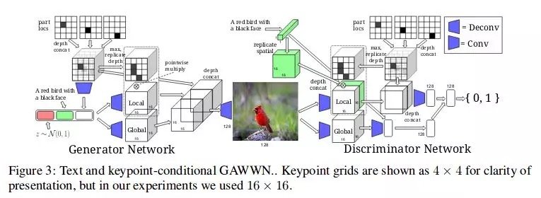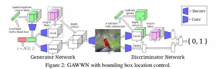 尽管 GAN-INT-CLS [18] 和 StackGAN [21] 可以基于文本描述生成图像,但是它们无法捕获图像中对象的定位约束。为了允许编码空间约束,GAWWN[26] 提出了两种可能的解决方案。 GAWWN 提出的第一种方法是通过空间变换网络对空间复制的文本嵌入张量进行学习,从而学习对象的边界框。