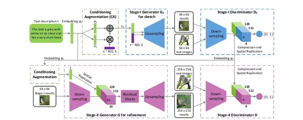 StackGAN [21] 建议使用两个不同的生成器进行文本到图像的合成,而不是只使用一个生成器。第一个生成器负责生成包含粗糙形状和颜色的对象的低分辨率图像,而第二个生成器获取第一个生成器的输出并生成具有更高分辨率和更清晰细节的图像,每个生成器都与其自己的判别器相关联。