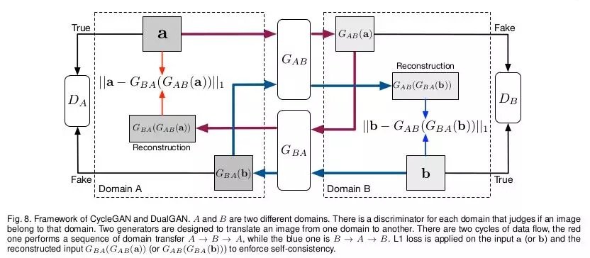 可以看到,两个生成器G(ab)和G(ba)正在进行相反的转换,这可以看作是一种双重学习。此外,DiscoGAN [33] 是另一种利用与下图相同的循环框架的模型。