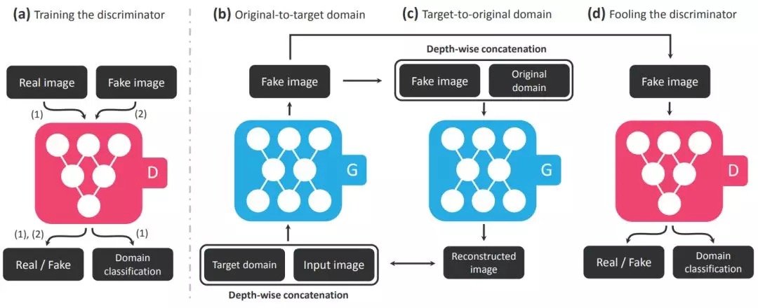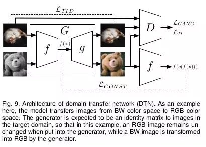 这里 f 充当特征提取器,并且 DTN 尝试在将输入图像传输到目标域之后保留输入图像的高级特征。给定输入图像 x∈xs 生成器的输出为 G(x)=g(f(x)),然后可以使用距离度量 d(DTN 使用均方误差 (MSE))定义特征重建错误。这篇论文之前我们进行过详细解读,可参看这篇文章[42]。