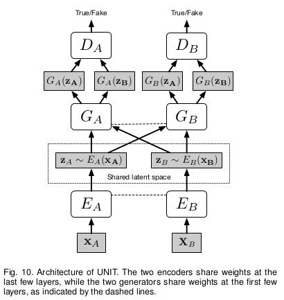 此外,UNIT 假设两个编码器共享相同的潜在空间,这意味着 xA,xB 是不同域中的相同图像,然后共享潜在空间意味着。基于共享潜在空间假设,UNIT 强制在编码器的最后几层之间以及发生器的前几层之间进行权重共享。