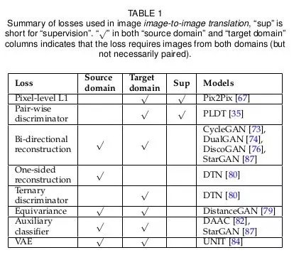 之前讨论的图像到图像转换方法,它们使用的不同损失总结在下表中: