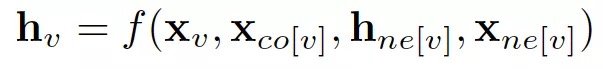 其中 x_co[v] 表示与 v 相连的边的特征,h_ne[v] 表示 v 相邻节点的嵌入,x_ne[v] 表示v 相邻节点的特征。函数 f 是将这些输入映射到 d 维空间上的过渡函数。由于我们要寻找 h_v 的唯一解,我们可以应用 Banach 不动点定理,将上面的方程重写为一个迭代更新过程。