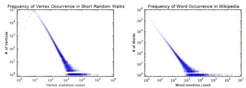 它在训练过程中非常类似于词汇嵌入。其动机是 graph 中节点和语料库中单词的分布都遵循幂律,如下图所示: