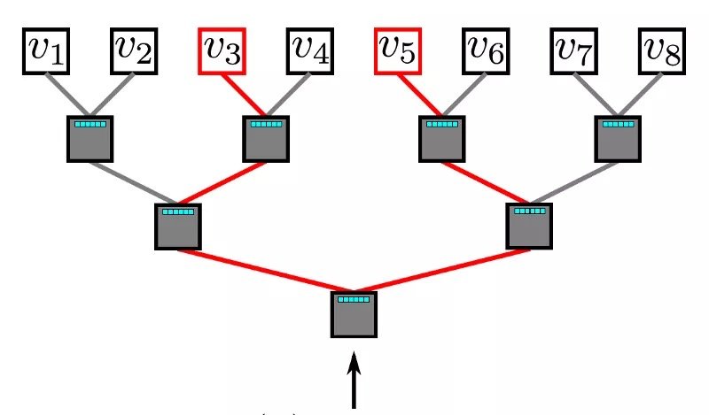 分层 softmax 利用二叉树来处理这个问题。在这个二叉树中,所有的叶子 (下图中的 v1, v2,…v8) 都表示 graph 中的顶点。在每个内部节点中,都有一个二元分类器来决定选择哪条路径。要计算给定顶点 v_k 的概率,只需计算从根节点到叶节点 v_k 路径上每一个子路径的概率。由于每个节点的子节点的概率之和为 1,所以所有顶点的概率之和为 1的特性在分层 softmax 中仍然保持不变。由于二叉树的最长路径是 O(log(n)),其中 n表示叶节点的数量,因此一个元素的计算时间现在减少到 O(log|V|)。