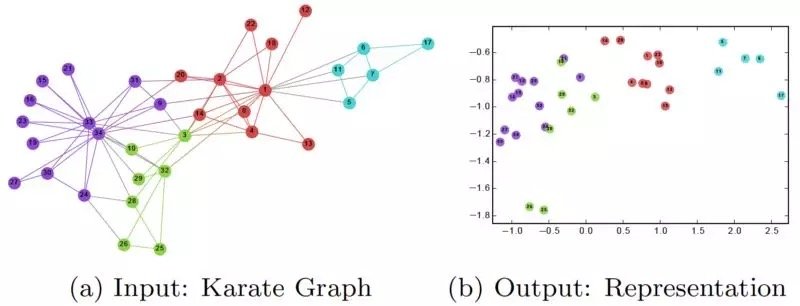 在训练完 DeepWalk GNN 之后,模型已经学习了每个节点的良好表示,如下图所示。不同的颜色表示输入图中的不同标签。我们可以看到,在输出图 (2 维嵌入) 中,具有相同标签的节点被聚集在一起,而具有不同标签的大多数节点都被正确地分开了。