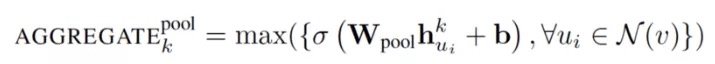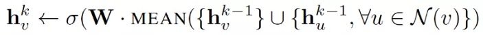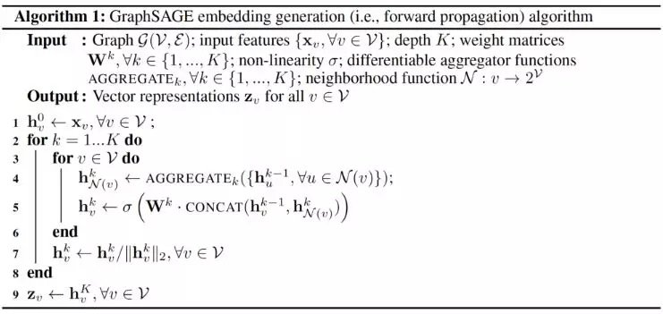 外层循环表示更新迭代的数量,而 h ^ k_v 表示更新迭代 k 时节点 v 的潜在向量。在每次更新迭代时,h ^ k_v 的更新基于一个聚合函数、前一次迭代中 v 和 v 的邻域的潜在向量,以及权重矩阵 W ^ k。