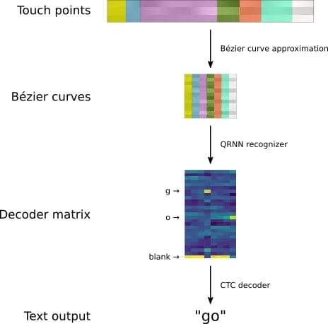 任何手写字符识别系统都需要从识别手指/输入设备的触点。我们在屏幕或者手写板上输入的笔画可以看做是一系列包含时间戳的出触点序列。考虑到输入的设备在尺寸、分辨率上各不相同,研究人员首先对输入的触点坐标进行了归一化处理。而后利用三次贝塞尔曲线来对触点序列进行描述,以便RNN能够更好的理解笔画序列的形状。