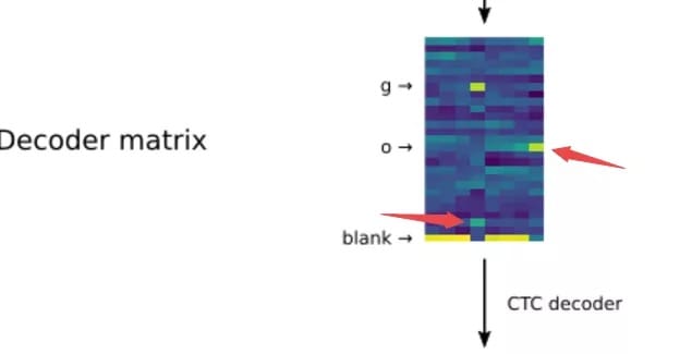 为了对曲线序列进行解码,识别出对应的字符,循环神经网络会生成一个表示字母可能性的解码矩阵。矩阵的每一列代表了一条贝塞尔曲线,而每一行则代表了对应输入曲线对应的字母可能性。在上图中的解码矩阵中,对于每一列我们可以看到它和先前的序列一起构成了26个字母上对应的概率分布。第一到第三条曲线序列都对应着blank(代表还没有识别出字符,来自于CTC算法),而到了第四条曲线时网络在g字母处得到了较高的概率,这意味着RNN从前面的四条曲线中识别出了字母g,而后面的第八条曲线上我们又可以看到字母o对应的位置有较高的概率。通过序列处理就能将曲线解码为对应的字符。