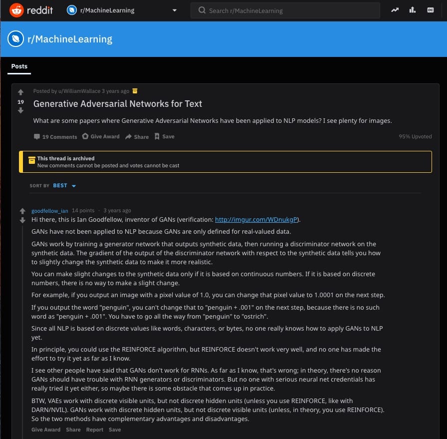 就在三年前,你可以找到Ian Goodfellow对这个Reddit主题的回复给用户询问你是否可以使用GAN作为文本: