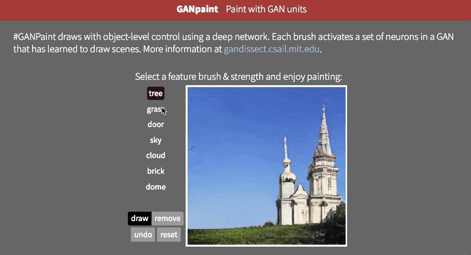 但是,目前尚不清楚网络是否能够推断场景中的对象,或者它是否只是记住这些对象。接近这个问题的答案的一种方法是试图以不切实际的方式扭曲图像。也许MIT CSAIL的GAN Paint互动网络演示中最令人印象深刻的部分是该模型似乎能够将这些编辑限制为“真实感”的变化。如果你试图将草坪放在天空上,这就是发生的事情: