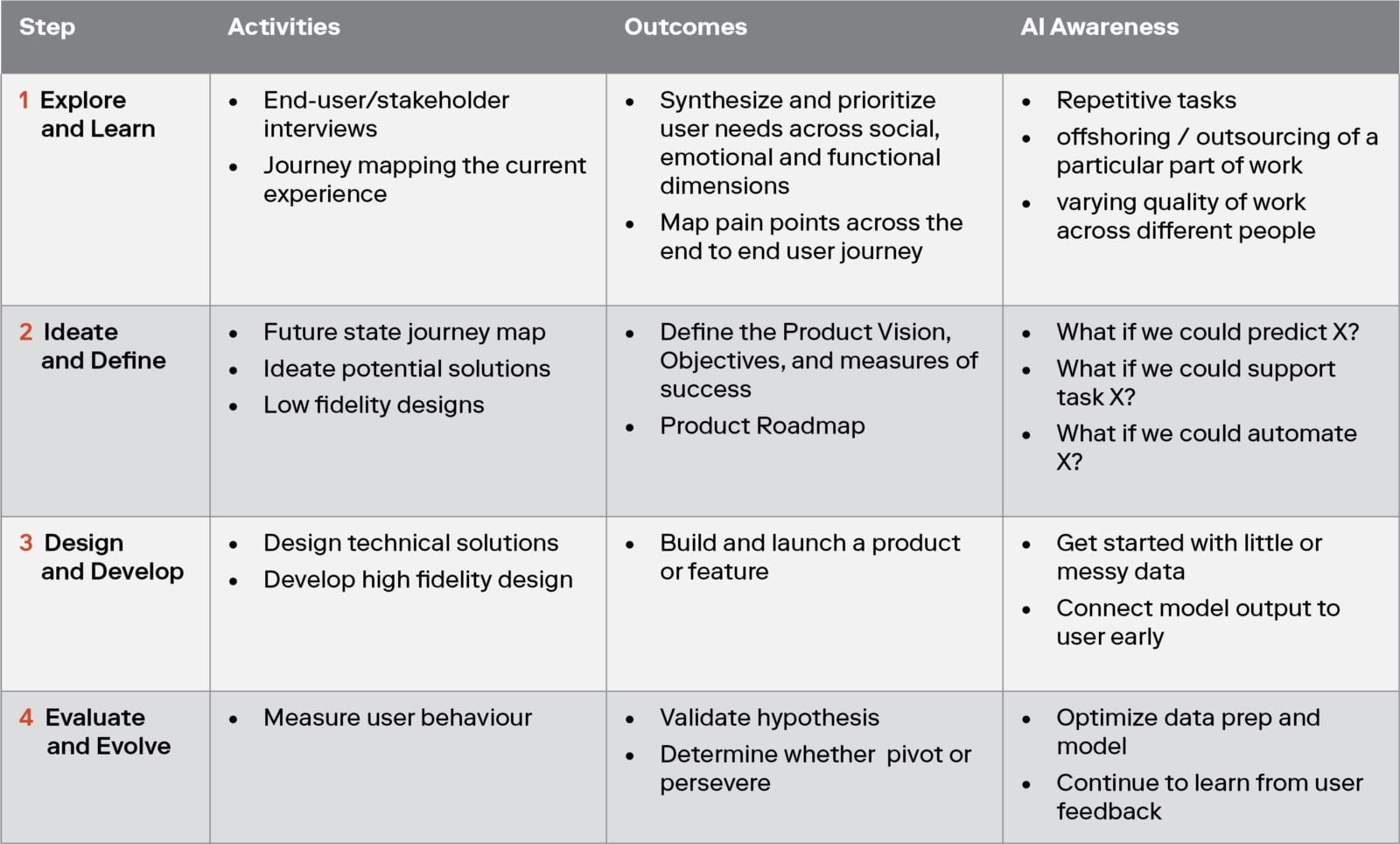 对于每个具有产品开发背景的人来说,我们在这里展示的内容可能非常熟悉。似乎软件行业在AI解决方案的开发方面再次经历了另一个“重新发明轮子”的循环。从用户需求开始,然后考虑人工智能如何满足这些需求,采取以人为本的方法,是创新和建立用户喜爱体验的有力方法。