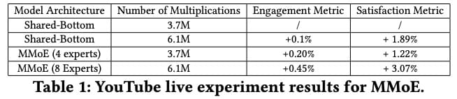 本文的结果表明,用MMoE替换共享底层可以提高模型的参与度(观看推荐视频所花费的时间)和满意度(调查响应)的性能。MMoE专家的数量和乘法运算的增加进一步提高了模型的性能。由于计算限制,无法在实时设置中增加此数字。