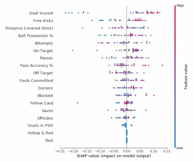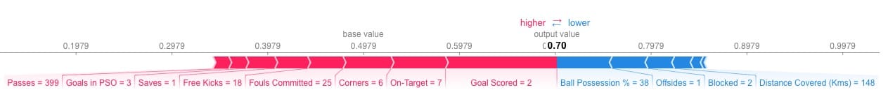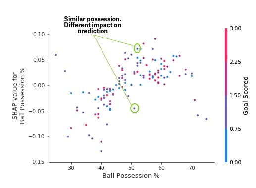 Goal Scored= 2对增加预测的影响最大,而ball possession特征对降低预测的影响最大。