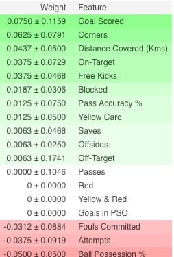 - 顶部的功能最重要,底部的功能最少。对于这个例子,得分的目标是最重要的特征。