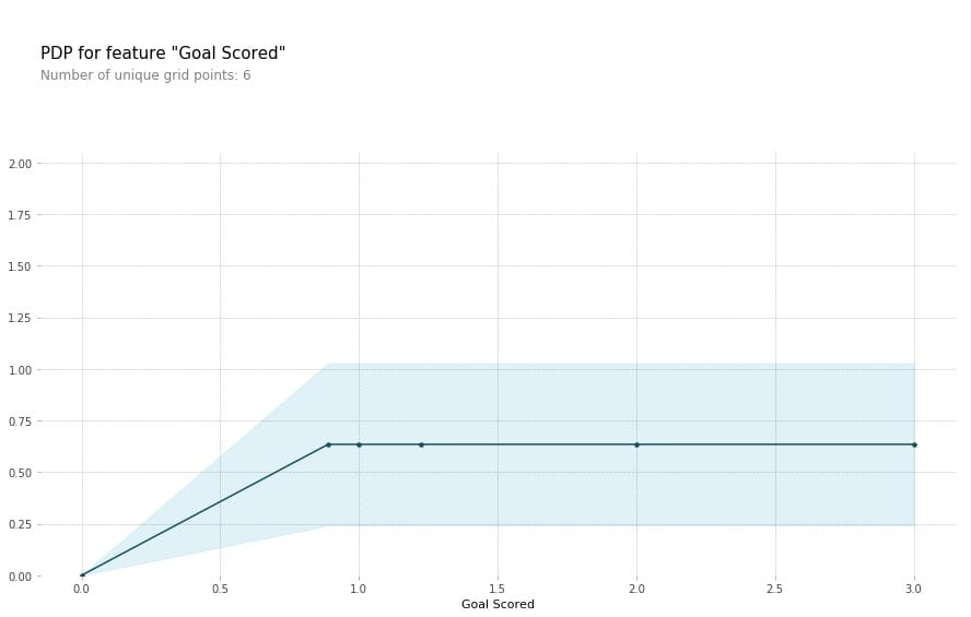 Section titled “plot it”pdp.pdp_plot(pdp_goals, ‘Goal Scored’) plt.show()`