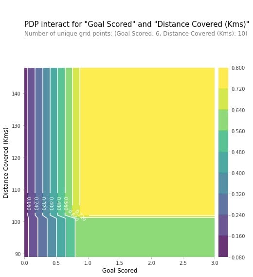 我们继续拟合我们的模型并计算一支球队拥有一名赢得“游戏人”的球员的概率,这是我们的目标变量。接下来,我们将选择一个变量并不断改变其值。例如,如果球队打进1球,2球,3球等,我们将计算结果。然后绘制所有这些值,我们得到预测的结果与目标得分的图表。用于绘制PDP的库称为