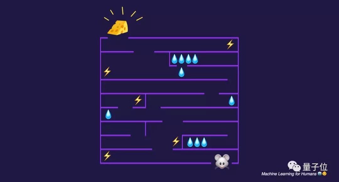 想象下你是那只老鼠,为了在迷宫中尽可能多地收集奖励(水滴和奶酪),你会怎么做?在每个状态下,即迷宫中的位置,你要计算出为获得附近奖励需要采取哪些步骤。当右边有3个奖励,左边有1个奖励,你会选择往右走。