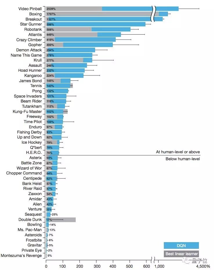上图源自DeepMind的DQN论文。在超过一半的测试游戏中,论文中的代理能够优于人类测试基准,通常为人类水平的两倍。但在一些游戏中,这个算法的表现差于人类水平。