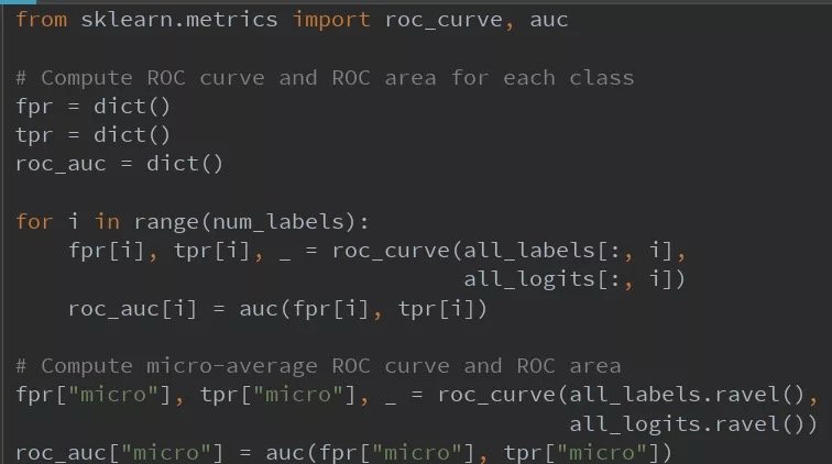 对于多标签分类,更重要的指标是ROC–AUC曲线。 这也是Kaggle比赛的评估指标。 我们分别计算每个标签的ROC-AUC。 我们还在个别标签的roc-auc分数上使用微观平均。