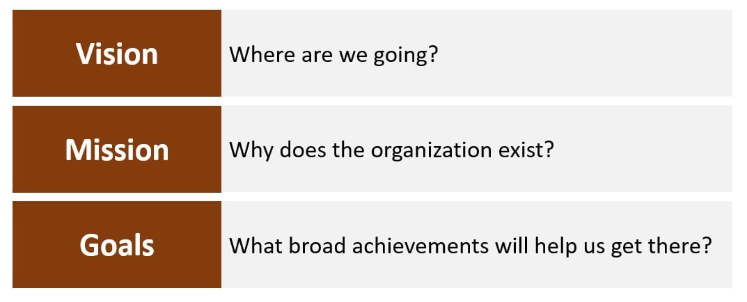 战略概述包括愿景,使命和高级目标。它们已被商业文献广泛涵盖,但这里有一个快速的复习: