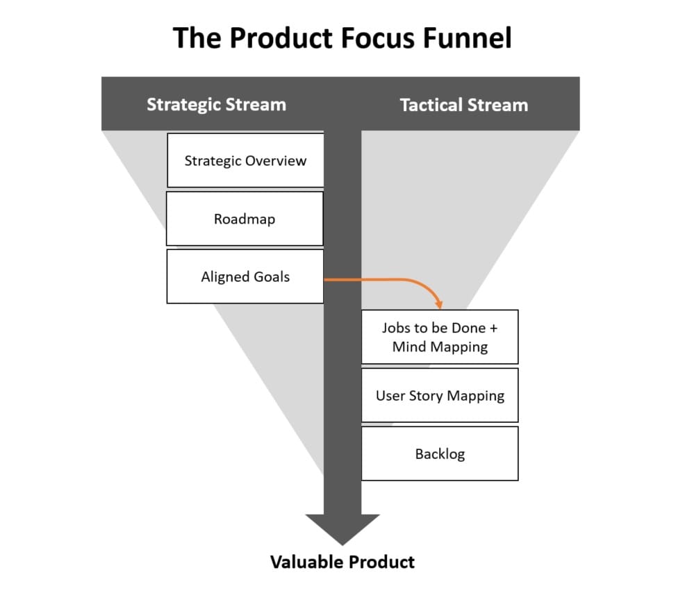 在Focus Funnel中,有两个流。第一个是战略流,旨在与目标设定和决策制定一致。第二个是战术流,它采用我们的战略,并提供了一个框架,用于揭示和优先考虑有价值的功能,并创建一个构建它们的行动计划。