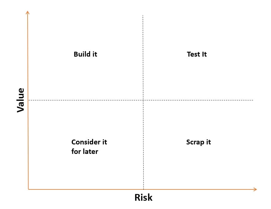 在确定用户故事的优先级并创建产品积压时,请确保按投资回报确定优先级。在创建路线图期间使用的风险/价值矩阵是在此重复使用的极好工具。