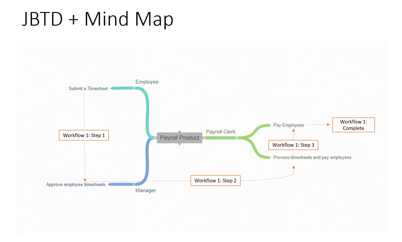 在要完成的工作和路线图之间存在一些重叠。如果我们已经正确验证了我们的路线图,我们就已经知道了我们认为可以解决的问题。但是,通过在思维导图上布置JTBD,我们可以添加关于我们假设的另一个详细程度,并与我们的用户验证这些假设。