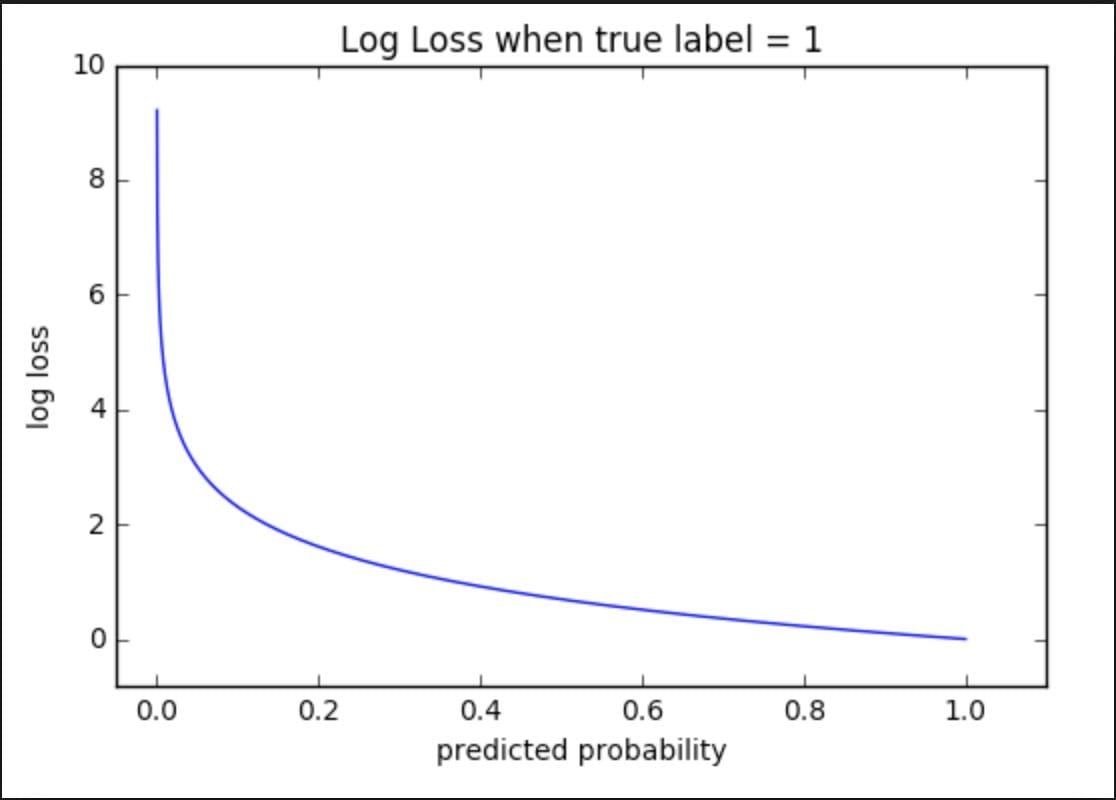 我们来看看上面的图表。注意它是如何说明“真正的标签= 1”。那么,这表明了基本事实。此外,该数字的斜率是显着的。当预测概率接近0时,我们的对数损失呈指数增长。而在另一端,日志损失接近0。