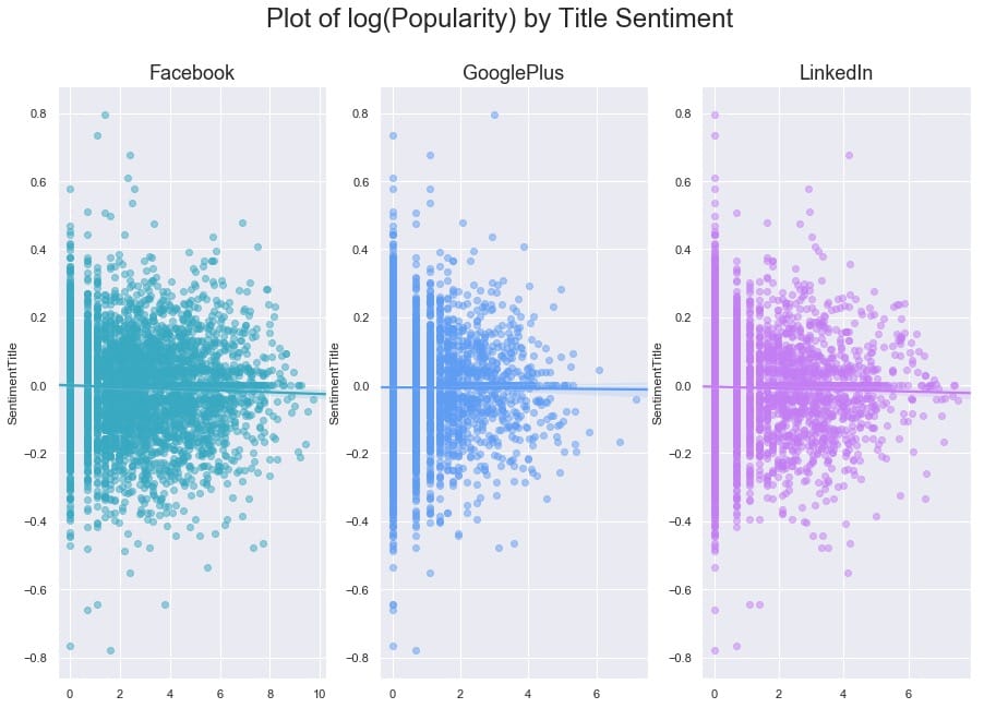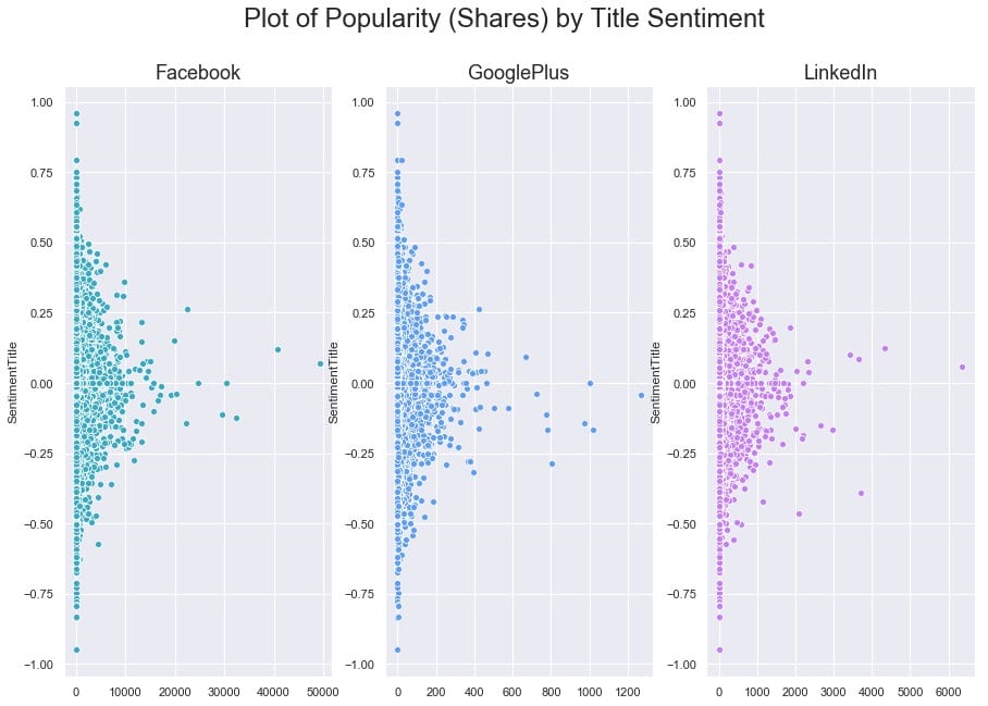 for platform, subplot, color in zip(platforms, subplots, colors): sns.scatterplot(x = main_data[platform], y = main_data[‘SentimentTitle’], ax=subplot, color=color) subplot.set_title(platform, fontsize=18) subplot.set_xlabel(”)