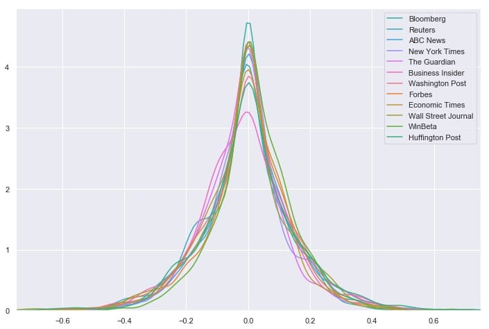 for source, color in zip(source_names, source_colors): sns.distplot(main_data.loc[main_data[‘Source’] == source][‘SentimentTitle’], ax=ax, hist=False, label=source, color=color) ax.set_xlabel(”)